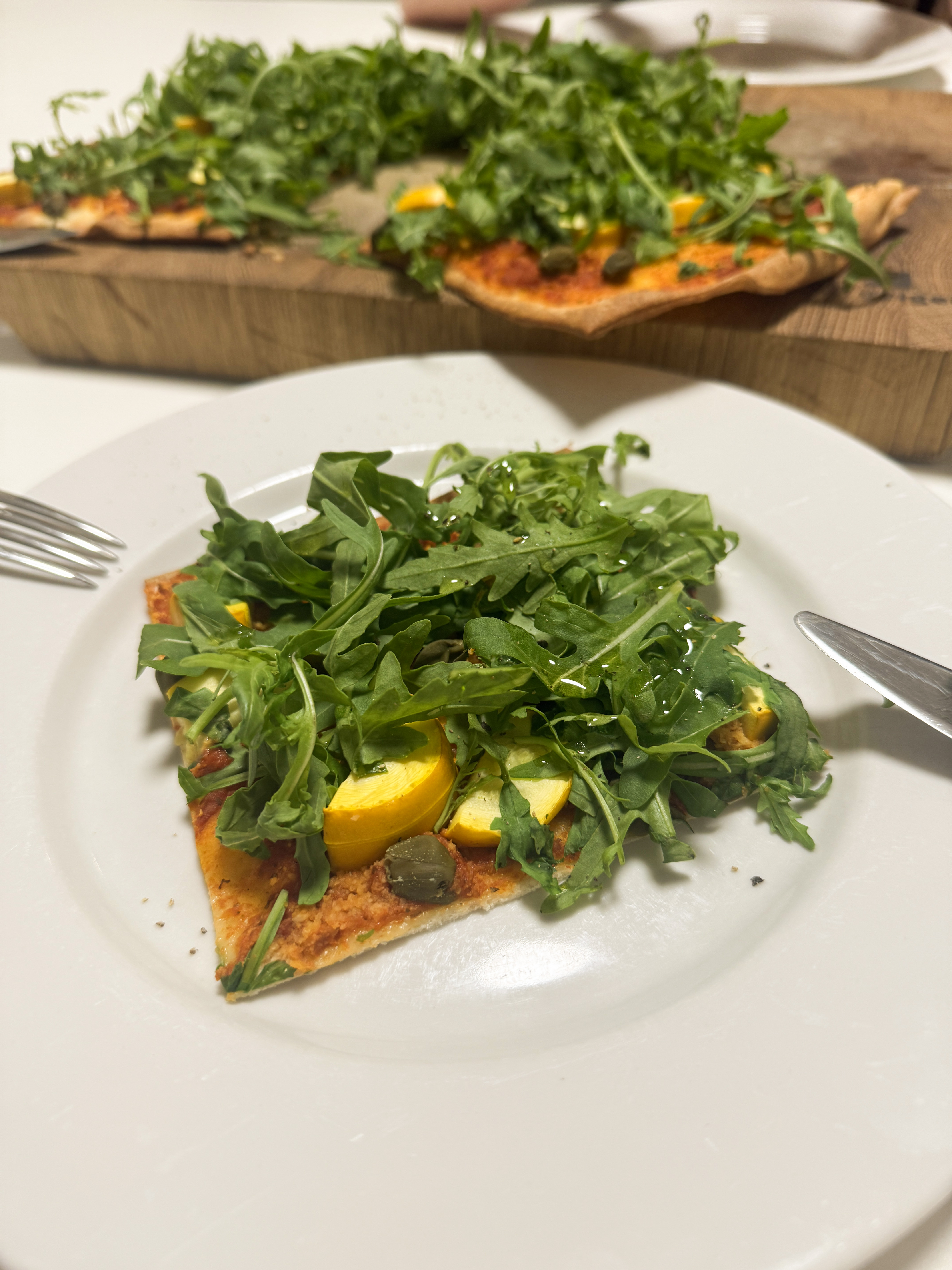 Heize den Backofen auf ca. 220 °C (Ober-/Unterhitze) vor. Rolle den Fertigteig auf einem Backblech mit Backpapier aus. Verteile die gehackten Tomaten gleichmäßig auf dem Teig. Mit Salz, Pfeffer und optional etwas gehacktem Knoblauch würzen. Zucchini und frische Tomate in Scheiben schneiden und die Pizza belegen. Streue Kapern darüber (Menge nach Geschmack).