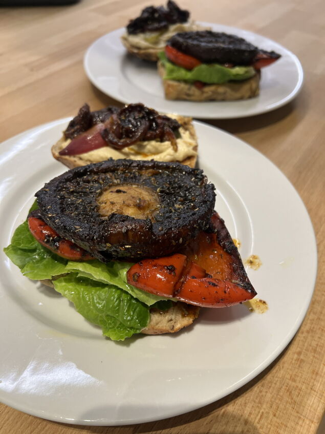 Bereite die Salatblätter vor und schneide die Gewürzgurke in Scheiben. Halbiere die Brötchen und krosse die Innenseiten im Backofen oder auf dem Toaster leicht an. Verteile anschließend auf der einen Seite die Burgersoße, Gewürzgurke, einen Teil der Zwiebeln und die Salatblätter und auf der anderen Seite den Hummus, die restlichen Zwiebeln und die getrockneten Tomaten. Sobald die Pilze und die Paprika die gewünschte Konsistenz erreicht haben, lege sie auch auf das Brötchen – und schon kann es losgehen.